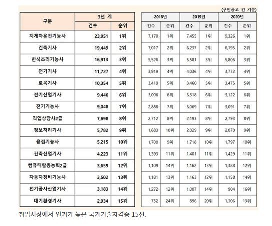 취업시장에서 인기가 높은 국가기술자격증 15선.