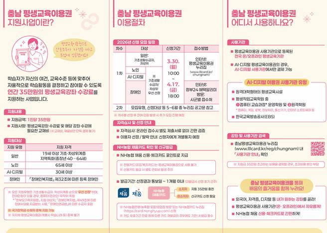 한편, 신청 및 카드발급 등 관련 문의는 충남 평생교육이용권 상담콜센터 또는 누리집 게시판을 통해 확인할 수 있다.