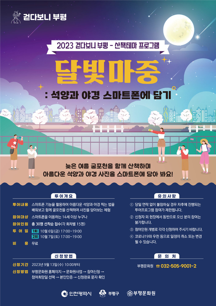 부평구가 주최하고 부평문화원이 주관하는 이번 투어는 스마트폰을 활용해 아름다운 석양과 야경을 찍는 법을 배우고 함께 굴포천을 산책하며 사진촬영을 하는 체험프로그램이다.