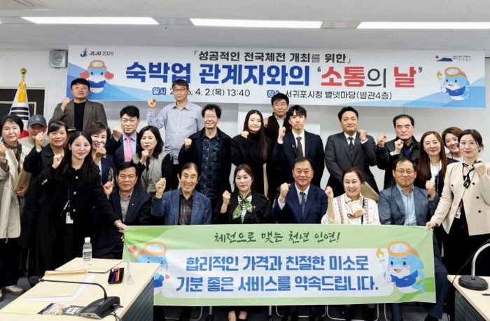 시는 4월 2일 서귀포시청 별넷마당에서 지역 숙박업 관계자들과 함께 ‘소통의 날’을 운영하고, 전국체전 기간 중 서귀포시를 찾게 될 선수단과 방문객들에게 보다 안전하고 쾌적한 숙박환경을 제공하기 위한 협력 방안을 논의했다.