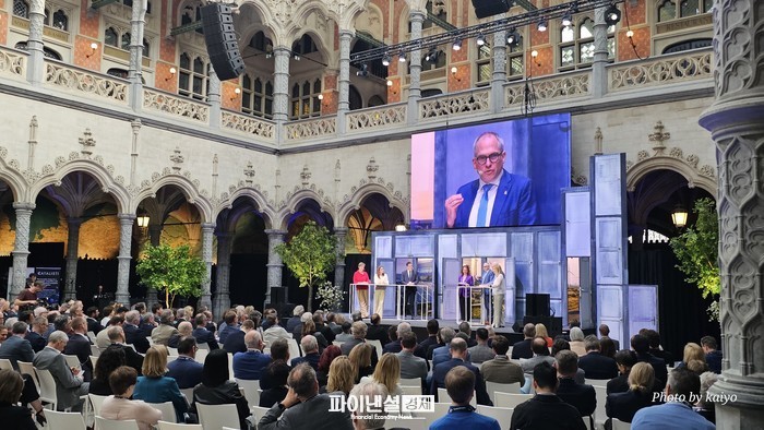 | ▲사진1. 한델스뵈르스, 벨기에 플랑드르 마티아스 디벤달레 총리가 플랑드르산업 서밋에서 토론을 하고 있다. |