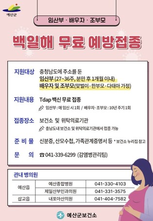 예산군, 임산부·배우자 백일해 무료 접종 대상 조부모까지 확대