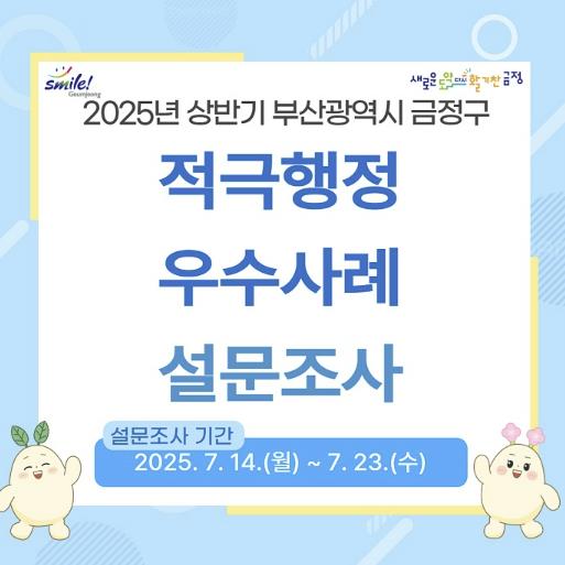 [파이낸셜경제=박영진 기자] 부산시 금정구는 구민이 만족하고 공감할 수 있는 적극행정 우수사례를 선정하고자 오는 23일까지 설문조사를 실시한다.