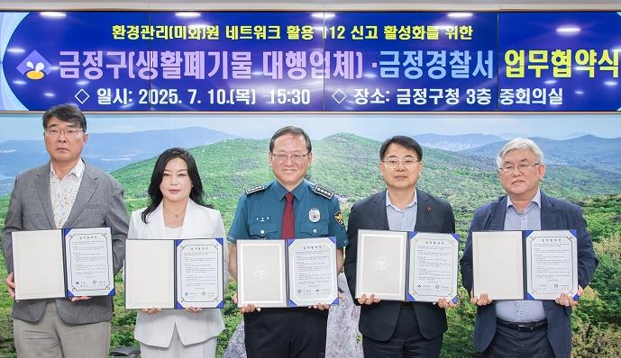 [파이낸셜경제=박영진 기자] 부산시 금정구와 금정구 생활폐기물 대행업체 현대실업, (주)세명기업사, 부광자원(주)는 지난 10일 환경 관리(미화)원 네트워크를 활용한 112 신고 활성화를 위하여 금정경찰서와 업무협약을 체결했다고 밝혔다.