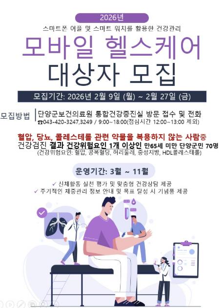 [파이낸셜경제=김기보 기자] 단양군은 군민의 만성질환 예방과 건강생활 실천을 지원하기 위해 ‘2026년 모바일 헬스케어 사업’ 대상자를 오는 27일까지 모집한다.