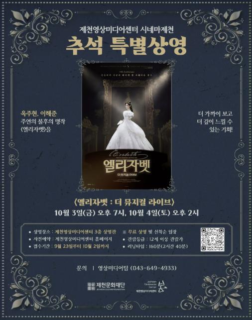 [파이낸셜경제=김기보 기자] 제천문화재단이 추석 연휴 기간인 10월 3일 오후 7시와 10월 4일 오후 2시, 제천영상미디어센터 3층 상영관에서 옥주현 주연의 뮤지컬 공연 실황 영화 '엘리자벳 : 더 뮤지컬 라이브'를 무료 상영한다.