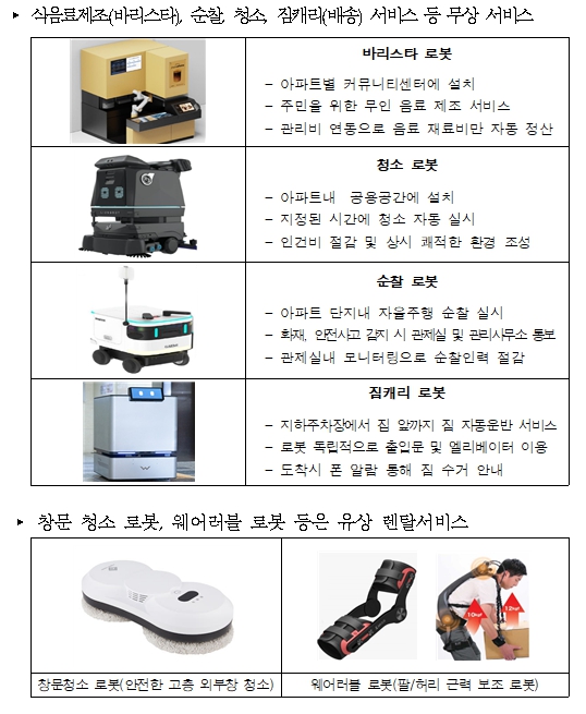 ‘스마트시티부산㈜’은 ‘순찰·바리스타·짐캐리 청소’ 등 4종 로봇 서비스를 아파트 단지 2곳에서 시범 운영 중이며, 이는 공동주택을 대상으로 로봇 통합 관제 플랫폼을 도입해 다양한 로봇 서비스를 제공하는 최초의 사례이다.