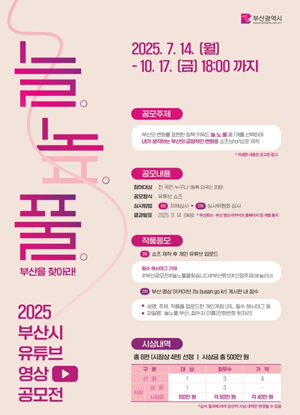 [파이낸셜경제=박영진 기자] 부산시는 오는 7월 14일부터 10월 17일까지 2025년 부산시 유튜브 영상 공모전 '늘. 노. 풀. 부산을 찾아라!'를 개최한다고 밝혔다.
