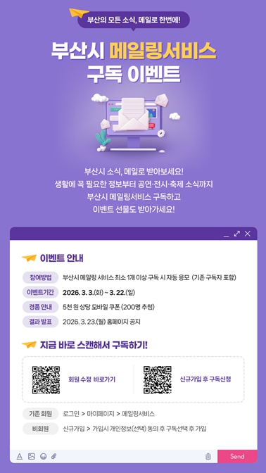 [파이낸셜경제=박영진 기자] 부산시는 시민들이 주요 시정 소식과 생활 정보를 보다 신속하고 편리하게 받아볼 수 있도록 오는 3월 3일부터 3월 22일까지 '부산시 소식, 메일로 한 번에(메일링 서비스 구독 이벤트)'를 추진한다고 밝혔다.