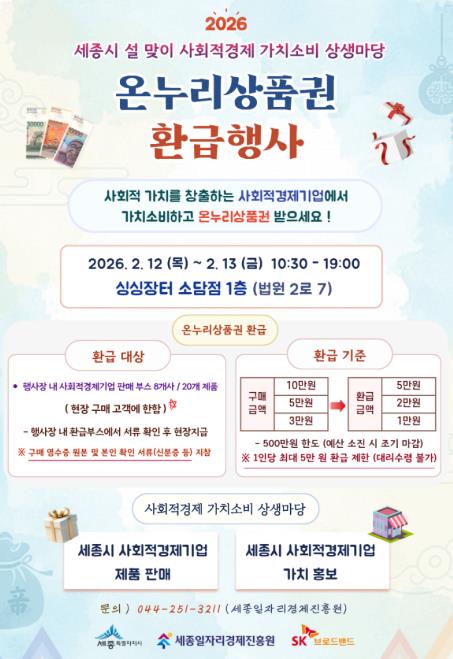 [파이낸셜경제=김영란 기자] 세종일자리경제진흥원이 설 명절 소비 대목을 맞아 오는 2월 12일부터 13일까지 양일간 싱싱장터 소담점(1층)에서 ‘2026년 설 맞이 사회적경제 가치소비 상생마당’을 운영한다.