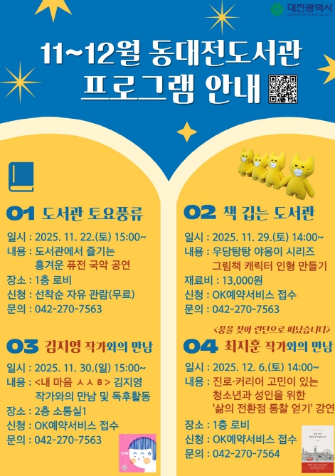 [파이낸셜경제=김영란 기자] 대전시 동대전도서관은 2025년 연말을 맞아 11월부터 12월까지 어린이, 청소년, 성인 등을 대상으로 다양한 독서문화 프로그램을 준비했다.
