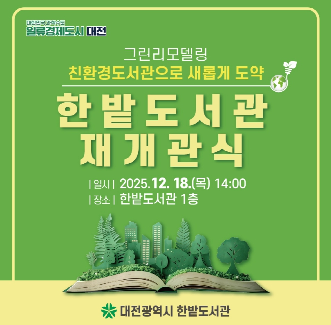 또한 1층 전시실에서는 12월 대전 지역 아마추어 작가 38인이 참여하는 그림책 전시전이 열리며, 홍보관에서는 한밭도서관의 그린리모델링 추진 과정과 성과를 소개하고 그린리모델링의 의미와 가치를 알아볼 수 있는 자리가 마련된다.