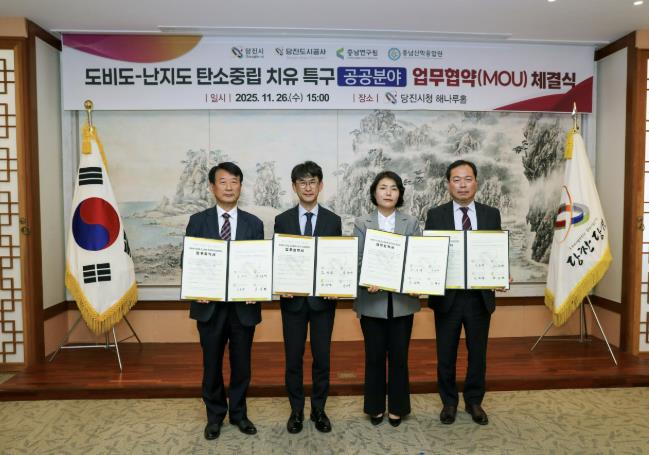 시는 지난 26일 당진시청 해나루홀에서 오성환 당진시장, 김양수 당진도시공사사장, 전희경 충남연구원장, 이종규 충남산학융합원장이 참석한 가운데‘도비도-난지도 탄소중립 치유 특구 공공분야 업무협약’을 체결했다고 27일 밝혔다.