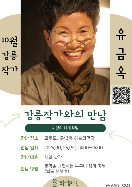 이번 10월 행사는 ‘시 창작법’을 주제로, 참가자들이 유금옥 시인과 함께 소통하며 시가 태어나는 과정을 가까이에서 듣는 시간이 될 예정이다.