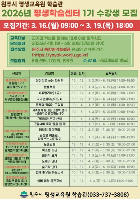 [파이낸셜경제=조성환 기자] 원주시 평생교육원 학습관은 3월 16일부터 19일까지 2026년 평생학습센터 1기 수강생을 모집한다.