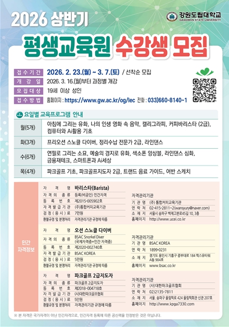 [파이낸셜경제=조성환 기자] 강원도립대학교는 2월 23일부터 3월 7일까지'2026년도 상반기 평생교육원 수강생'을 모집한다고 밝혔다.