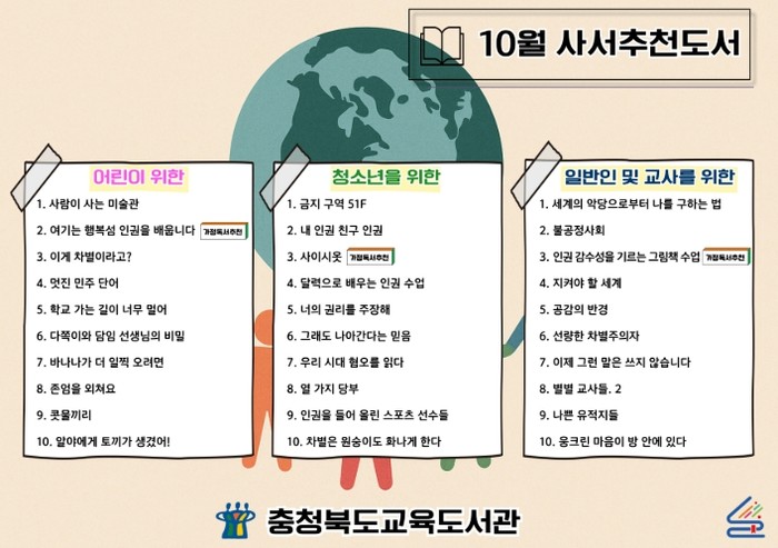 [파이낸셜경제=김기보 기자] 충청북도교육청 직속기관 교육도서관은 '사람답게 살고 있습니까, 휴먼?(인권)'을 주제로 2025년 언제나 책봄 열두달 북큐레이션 10월 사서추천도서 30권을 선정했다.