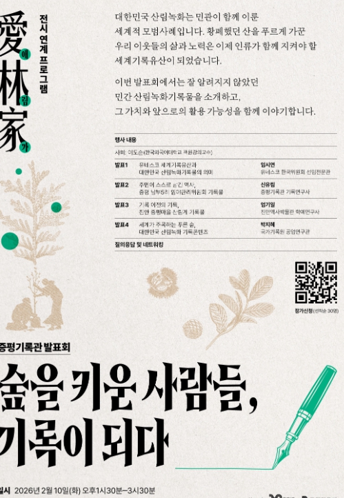 이재영 군수는 “산림녹화는 국가 정책과 주민의 헌신이 함께 만든 세계적 성과”라며 “이번 발표회를 통해 숲을 가꾼 사람들의 시간이 기록으로 남아 다음 세대와 세계로 이어지는 의미있는 계기가 되길 바란다”고 밝혔다.