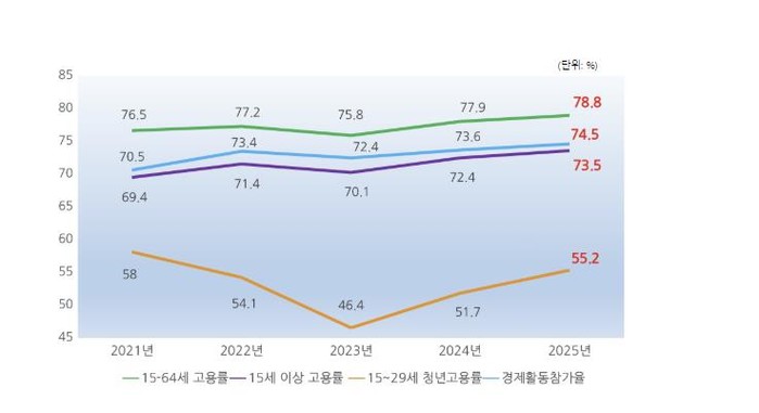 군에 따르면, △OECD 기준 15~64세 고용률 78.8%(지난해 하반기 比 0.9↑) △15세 이상 전체 고용률 73.5%(지난해 하반기 比 1.1↑) △청년고용률 55.2%(지난해 하반기 比 3.5↑) △경제활동참가율 74.5%(지난해 하반기 比 0.9↑)로 각 분야에서 도내 1위를 기록했다.