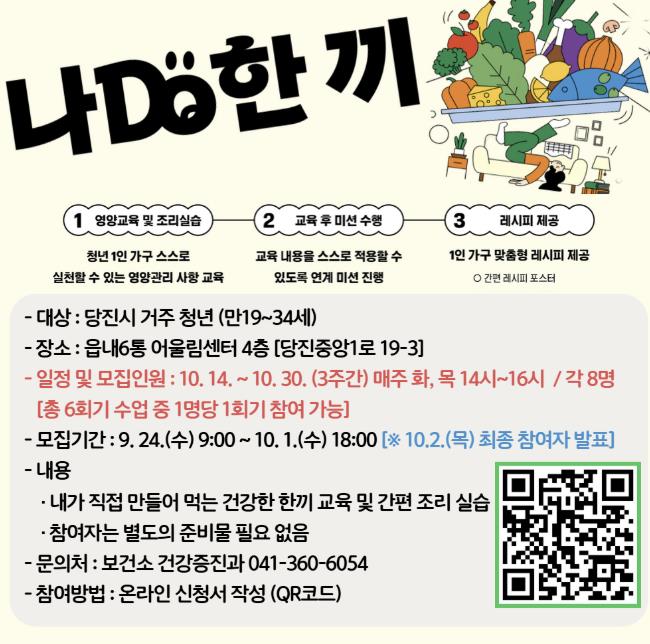 특히, 만 19세부터 34세까지의 당진시에 거주하는 청년층을 대상으로 영양관리 프로그램‘나DO한끼’를 10월 14일부터 30일까지 총 6회기에 걸쳐 운영한다.
