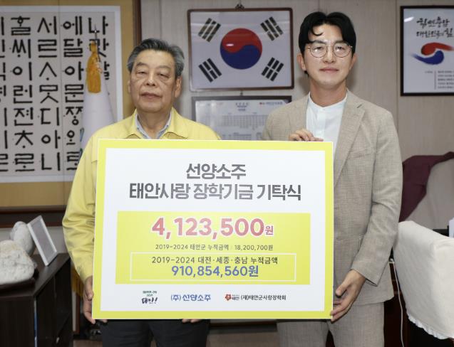 이번 기탁액은 지난해 태안지역에서 판매된 ‘선양 린’ 병당 적립액으로, ㈜선양소주는 병당 5원을 장학금으로 기탁하며 지역 발전을 위한 사회적 소임을 다하고 있다.