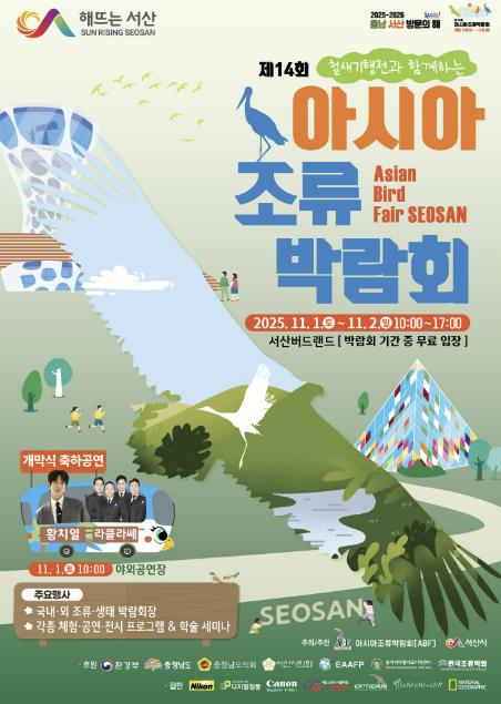 [파이낸셜경제=김영란 기자] 충남 서산시는 서산버드랜드에서 오는 11월 1일부터 2일까지 ‘한국의 둥지 천수만, 세계의 둥지를 서산에 틀다’를 주제로 제14회 아시아 조류박람회를 개최한다고 밝혔다.