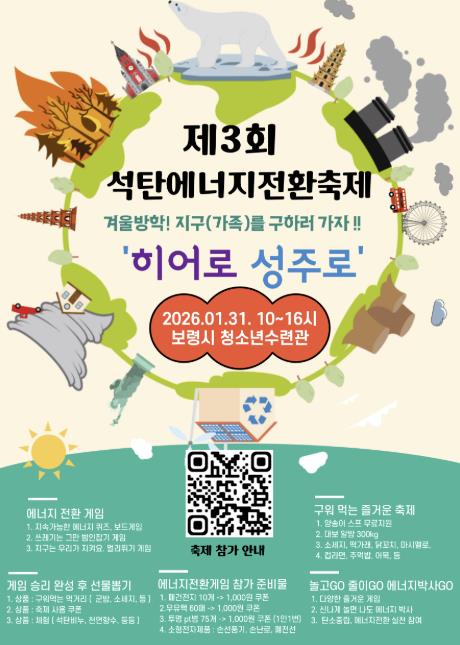 [파이낸셜경제=김영란 기자] 보령시가 주최하고 성주면 개화1리마을회가 주관하는 ‘제3회 겨울방학 석탄 에너지전환 축제’가 오는 1월 31일 오전 10시부터 오후 4시까지 보령시청소년수련원 일원에서 개최된다.