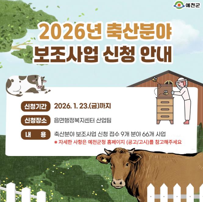 [파이낸셜경제=김지훈 기자] 예천군은 2026년도 축산 7개 분야 66여 개의 보조사업에 대해 23일까지 읍‧면 행정복지센터에서 신청을 받는다고 밝혔다.