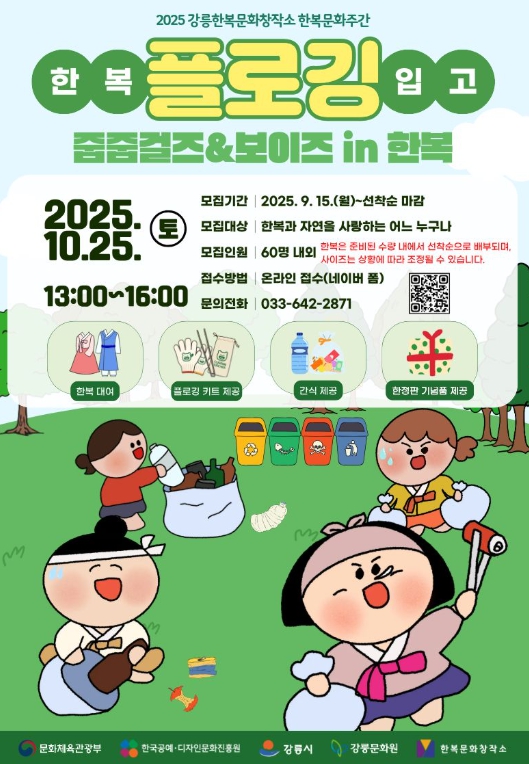 행사는 10월 25일 오후 1시부터 4시까지 강릉 주요거리 및 남대천 일대에서 진행되며, 참여자에게는 한복 대여, 플로깅 키트, 간식, 한정판 기념품 등의 혜택이 제공된다.