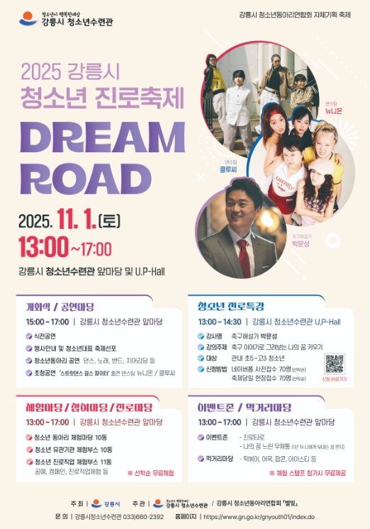 [파이낸셜경제=조성환 기자] 강릉시 청소년수련관은 오는 11월 1일 오후 1시부터 5시까지 강릉시 청소년수련관 앞마당 및 유피홀에서 청소년들의 진로 탐색과 자율적 참여 확대를 위한 2025 강릉시 청소년 진로축제 'Dream Road'를 개최한다.