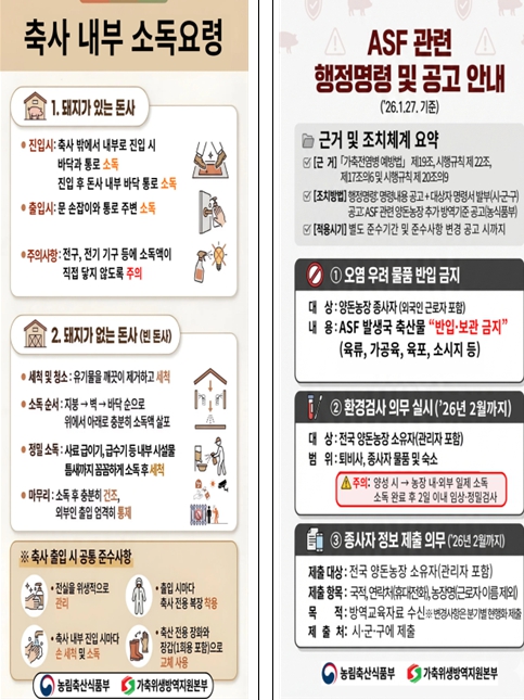 안재완 강원특별자치도 동물방역과장은 “최근 아프리카돼지열병은 특정 지역이나 계절에 국한되지 않고 전국적으로 산발적 발생 양상을 보이고 있다”며 “강화된 행정명령과 공고사항은 선택이 아닌 의무사항이라는 인식 아래 철저히 이행해 주길 바란다”고 강조했다.