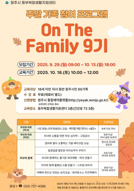 [파이낸셜경제=조성환 기자] 원주시동부복합생활지원센터는 오는 10월 18일, 주말 가족 프로그램 ‘온 더 패밀리(On The Family)’ 9기 과정을 운영한다.