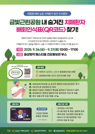 [파이낸셜경제=김기보 기자] 음성군 치매안심센터는 이달 26일부터 27일까지 금왕읍 금빛근린공원 일원에서 치매환자 실종 예방과 치매 인식 개선을 위한 ‘숨겨진 배회인식표(QR코드) 찾기’ 체험행사를 개최한다고 밝혔다.
