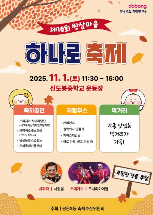 [파이낸셜경제=김예빈 기자] 서울 도봉구 쌍문3동이 오는 11월 1일 신도봉중학교 운동장에서 ‘제10회 쌍삼마을 하나로 축제’를 개최한다.