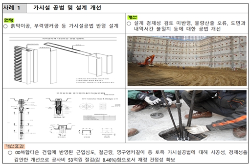 [가시설 공법 및 설계 개선] 복합타운 건립 등 대규모 토목 공사에서 흙막이 및 부력앵커 공법을 심사해 밑동 묻기(근입) 심도, 철근량, 영구앵커 길이 등을 현장 여건에 맞게 조정하여 약 53억 원(8.46%)의 공사비를 절감했다.