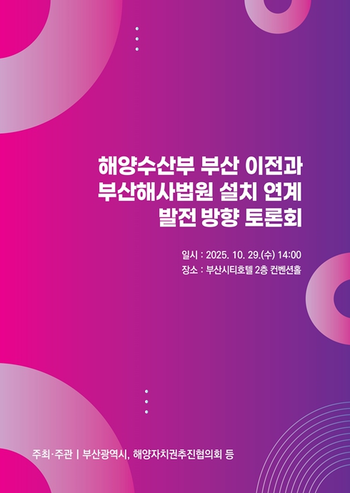 이번 토론회는 사전 신청 없이 부산의 미래 해양정책과 해사법원 부산설립에 관심 있는 시민 누구나 자유롭게 참여할 수 있으며, 자세한 내용은 시 누리집 공지사항에서 확인할 수 있다.