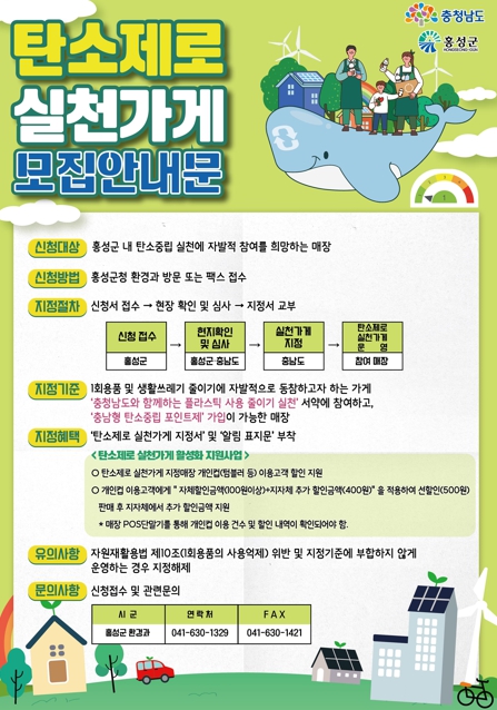 신청은 홍성군청 환경과 청소행정팀 방문 또는 팩스로 연중 수시 신청 가능하며, 지정 기준은 ▲1회용품 및 생활쓰레기 줄이기에 자발적으로 동참 ▲‘충청남도와 함께하는 플라스틱 사용 줄이기 실천’ 서약 참여 ▲‘충남형 탄소중립 포인트제’ 가입이 가능한 곳이어야 한다.