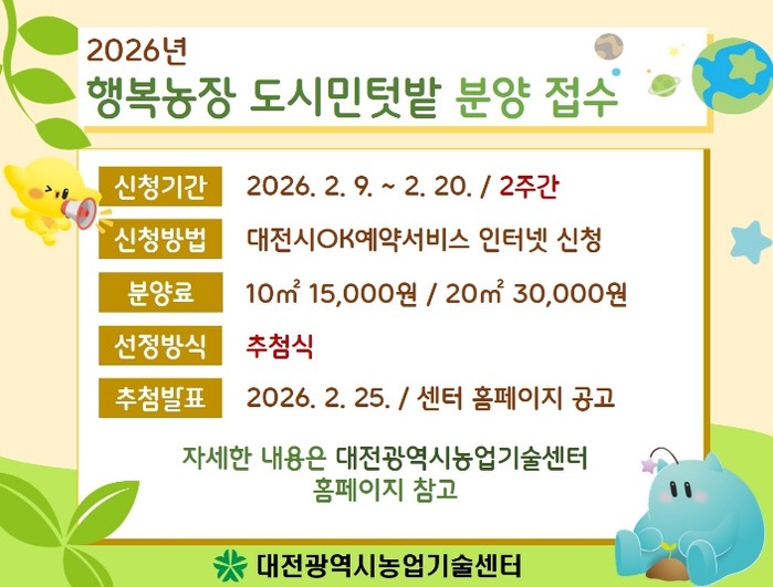 [파이낸셜경제=김영란 기자] 대전시농업기술센터는 도심속 농업․농촌 체험을 통한 도시농업 확산을 위해 2월 9일부터 대전시민을 대상으로 행복농장(도시민텃밭) 참가자 110세대를 모집한다.