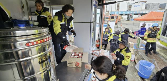 [파이낸셜경제=김지훈 기자] 경산소방서 하양남성·여성의용소방대가 10일 오전 7시47분쯤 경북 경산시 하양읍 대한송유관공사에서 발생한 화재 현장에서 소방대원들을 위한 급식 및 물품 지원 활동을 펼쳐 훈훈함을 더하고 있다.