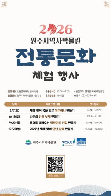 [파이낸셜경제=조성환 기자] 원주시역사박물관은 새해를 맞아 ‘2026 전통문화 체험 행사’를 운영한다.