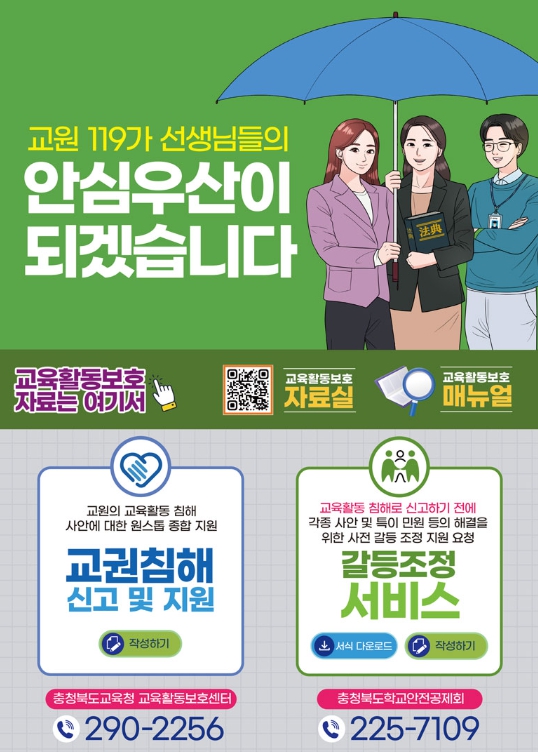 [파이낸셜경제=김영란 기자] 충청북도교육청이 17일, 교권보호를 강화하고 학교 현장의 안정화를 위해 교원 119 갈등조정 서비스를 운영한다고 전했다.