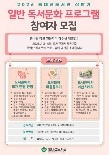 [파이낸셜경제=김영란 기자] 동대전도서관은 새봄을 맞아 3월부터 4월까지 시민들의 문화 향유 기회 확대를 위한‘상반기 성인 독서문화 프로그램’을 운영한다.