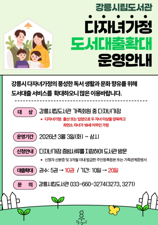[파이낸셜경제=조성환 기자] 강릉시립도서관은 오는 3월 3일부터 도서관 가족회원 중 다자녀가정을 대상으로 도서 대출 서비스를 확대 운영한다.