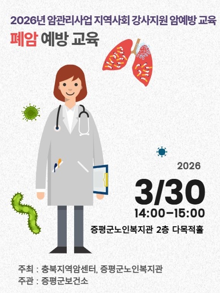 [파이낸셜경제=김기보 기자] 충북 증평군보건소는 오는 30일 오후 2시부터 3시까지 증평군노인복지관 2층 다목적홀에서 지역 주민 50명을 대상으로 폐암 예방교육을 진행한다고 밝혔다.
