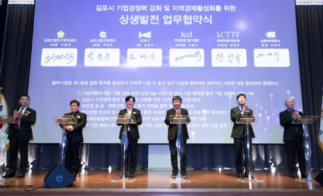 | ▲ 기업경쟁력 강화 및 지역경제활성화를 위한 상생발전 업무협약식 사진. 왼쪽에서 세 번째가 김병수 김포시장. |