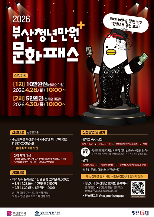 다만, ‘2026년 청년문화예술패스’ 대상자(2006~2007년생)와 2024년~2025년 사업 수혜자(부산청년만원+문화패스, 청년문화예술패스)는 중복 지원 방지를 위해 이번 신청에서 제외된다.
