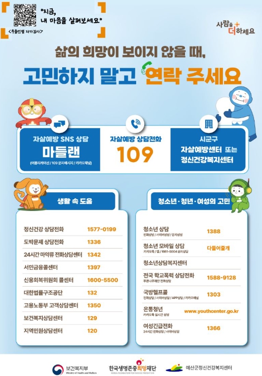 특히 주민들이 위기 상황에서 즉시 도움을 받을 수 있도록 상담기관 안내를 적극 홍보하며 우울감이나 무기력감, 극심한 스트레스 등으로 어려움을 겪고 있는 경우 혼자 고민하지 말고 즉시 도움을 받아야 한다고 당부했다.