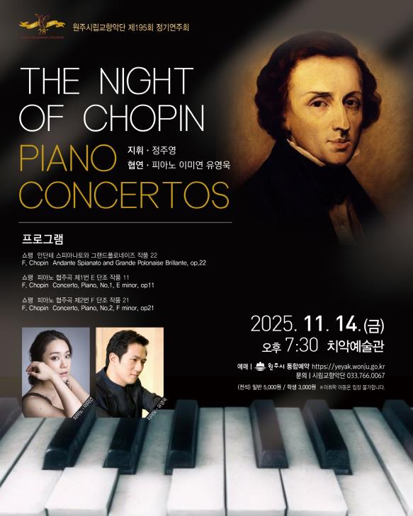 [파이낸셜경제=조성환 기자] 원주시립교향악단은 오는 14일 오후 7시 30분, 치악예술관에서 제195회 정기연주회 ‘The Night of CHOPIN’을 개최한다.
