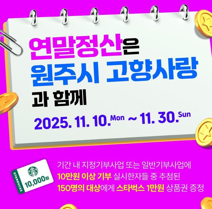 추첨 대상은 2025년 11월 10일부터 30일까지 원주시 지정기부사업 또는 일반기부사업에 10만 원 이상 기부한 사람이다. 무작위 추첨을 통해 총 150명에게 모바일 스타벅스 1만 원 상품권이 제공될 예정이다.