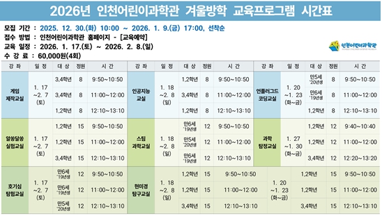 [파이낸셜경제=김기보 기자] 인천시설공단 인천어린이과학관은 겨울방학을 맞이해 어린이들의 과학적 탐구 능력을 증진할 수 있는 '2026년 겨울방학 교육프로그램'을 내달 17일부터 2월 8일까지 운영한다.